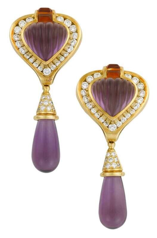 18 karat yellow gold, amethyst and diamond drop earrings, Lagos