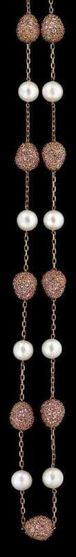 Featuring fourteen alternating pink pave sapphire set beads, approximately 48 carats, and fourteen cultured pearls, approximately 11mm each.