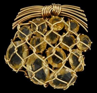 Thirteen cushion cut light yellow citrine of varying size prong set and captured within 18 karat yellow gold wire 'net' motif with 'knot' at the top.