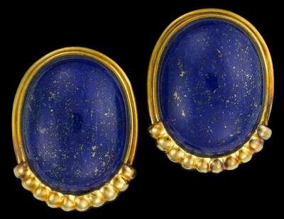 Oval cabochon lapis, bezel set over gold accenting, omega backs, signed by the maker.