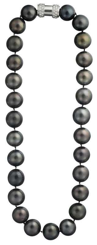 Slightly graduated black pearls, 16mm-16.5mm each, 18 karat white gold clasp accented on each end by pave set round cut diamonds.