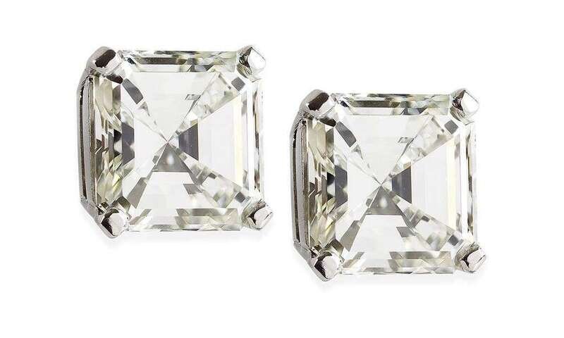 Single Asscher cut diamond, featuring post and butterfly fittings. Total diamond weight approximately 7.56 carats.