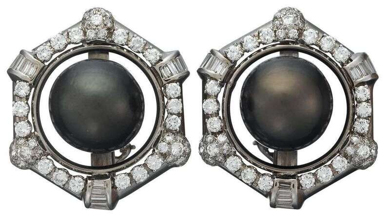 Single pearl, 16mm, framed by round and baguette diamond accented wagon wheel form jacket. Accompanied by interchangable polished 18 karat yellow gold jacket. Both signed EK.