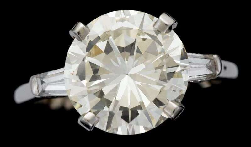 Single round cut diamond, approximately 5.60 carats, flanked on either side by tapered baguette cut diamonds.