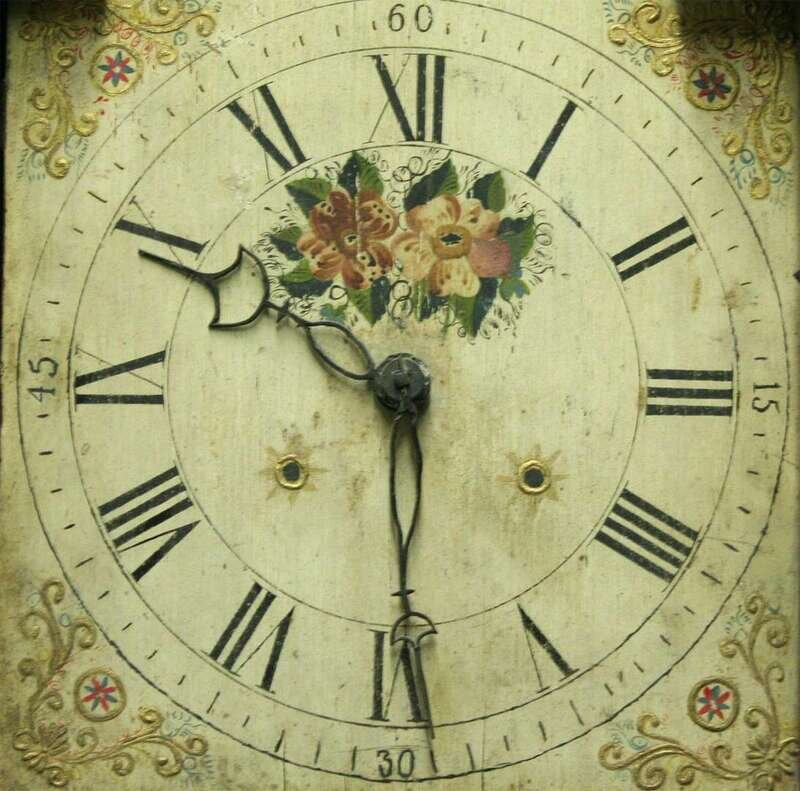 Arched cresting displaying twin scrolls with blank rosettes, arched face door flanked by slender columnettes, painted arched wooden face with scene of a church and trees above, black on white Arabic numeral chapter ring, painted gilt, red and blue spandrels, wooden works, rectangular lip molded waist door on straight bracket feet.