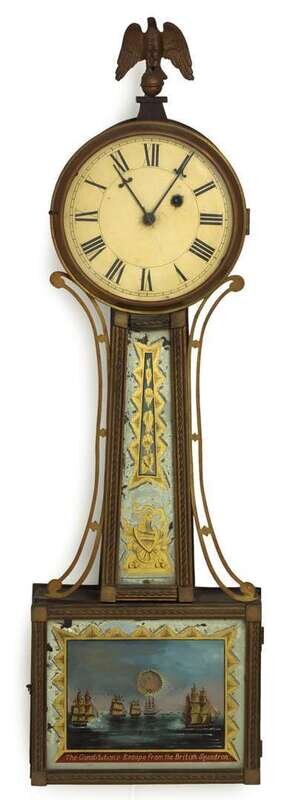Brass winged eagle and ball finial, black on white Roman numeral chapter ring, black, white and gold neck panel with eagle seated on a cannon below, brass openwork spandrels, eglomisé base door, "The Constitution's escape from the British Squadron," surrounded by black, white and gold, neck and base door frames are gilded with rope carving.