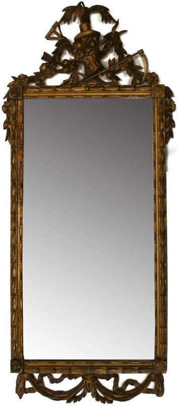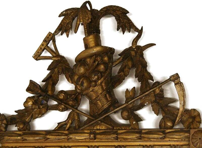 Cresting with arrangement of farming tools, apple filled basket and floral swags above frame molded with beading and bellflowers, floral swag pendant.