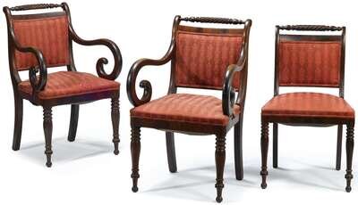Two armchairs and one side chair, each with spiral-turned crestrails above upholstered backs, scrolled arms, tapering, vase-turned legs ending in ball feet.