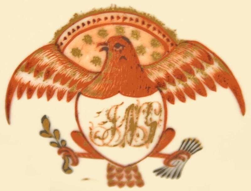 Of lighthouse form with flat lid with gilt berry knop, the body painted to show sepia spread-wing eagle emblazoned with shield; together with a tea bowl with orange eagle and shield decoration, gilt monogram.