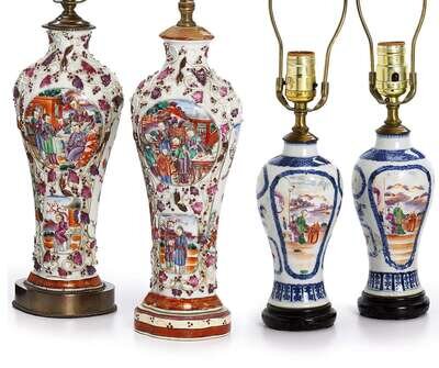 The first two of baluster form with underglazed blue reserves enclosing polychrome Mandarin figures; the second, with applied leafage and squirrels enclosing polychrome reserves with Mandarin figures, all drilled for lamps.