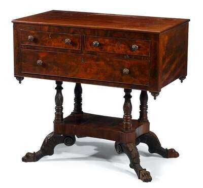 The rectangular top above three beaded drawers and four carved columnar supports, shaped platform and acanthus and paw-carved feet, on casters.
