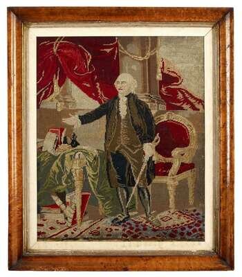 Depicting George Washington as statesman, wool and silk on a linen ground, matted and framed.