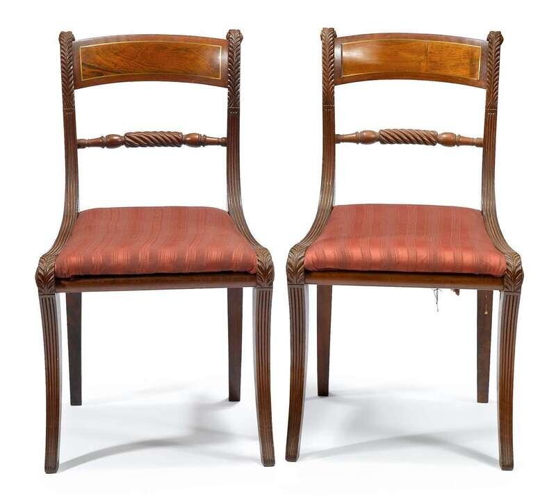 Pair of Classical carved and brass inlaid mahogany chairs circa 1815