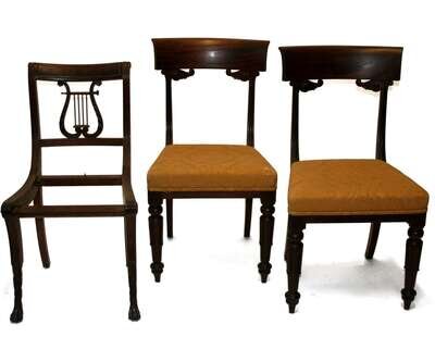 Including a pair, each with back scrolled tablet crest with rondel and leaves at carved stiles, lotus-carved turned tapering legs on casters; together with a Duncan Phyfe-style lyre-back side chair.