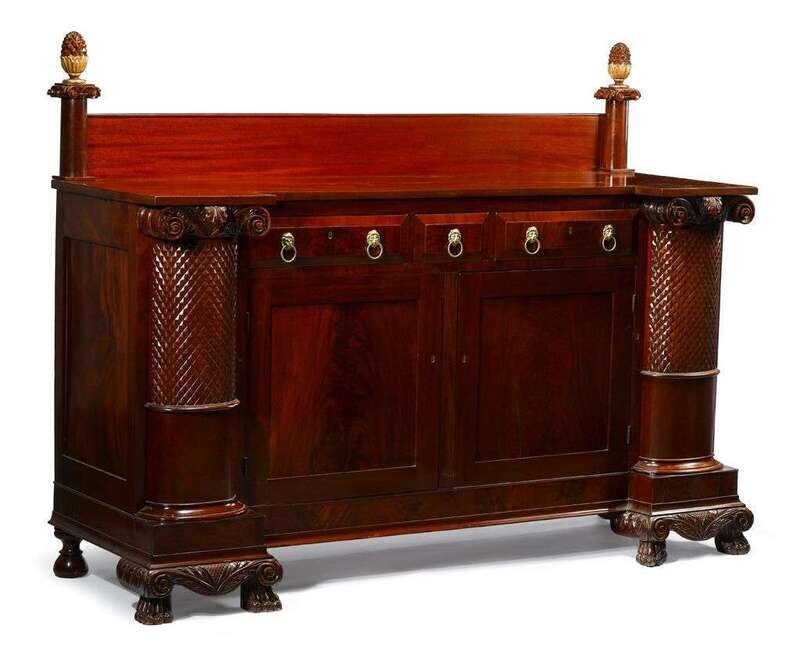 The rectangular top surmounted by a backsplash with two carved pineapple finials above three short drawers over two panel doors flanked by two large carved columns with Corinthian-style capitals and diaperwork on carved paw feet.