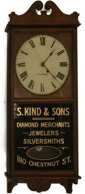 Double scroll crest panel, circular black on white Roman numeral chapter ring, black eglomisé glass below "S Kind & Sons, Diamond Merchant, Jewelers, Silversmiths, 1110 Chestnut St. (Philadelphia)."