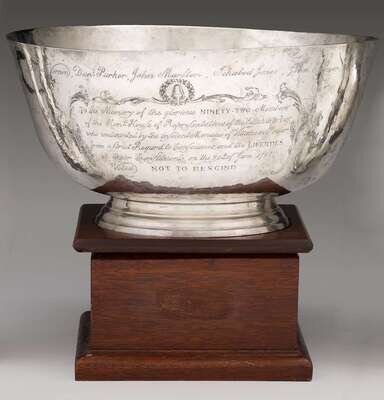 Of circular form with all-over hammered finish and a conforming foot, engraved on one side with crest comprised of scrolls, the Liberty Bell and flags encircling "No 45 Wilkes & Liberty," on the other side with dedication "To the Memory of the glorious Ninety-Two," and around the rim with the names of the fifteen members of the Sons of Liberty who commissioned the original bowl; fitted on a removable square wood pedestal.