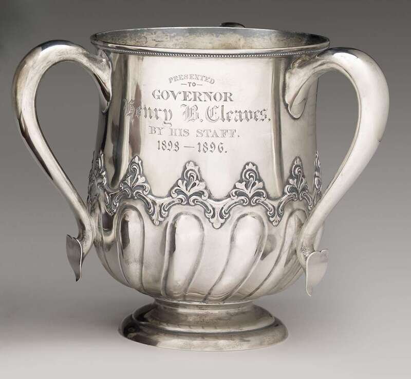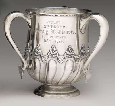 Having three scrolling handles with heart terminals, acanthus midband above spiral lobed lower body, raised on stepped circular foot; one panel engraved "Presented to Governor Henry B. Cleaves by his staff 1893-1896."; the second with names of his staff; and the third with the Maine coat-of-arms.