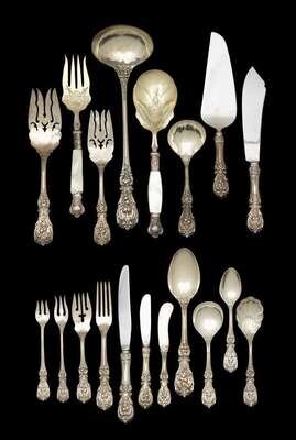 "Francis I" pattern, including twelve dinner forks, twelve salad forks, twelve seafood forks, twelve hollow handle dinner knives, twelve hollow handle butter spreaders, twenty-four teaspoons, twelve cream soup spoons, three hollow handle pie and cake servers, one hollow handle fish knife, two sugar shells, one gravy ladle, one sauce ladle, two serving spoons, two pickle forks, one large serving fork, one serving fork, one flat handle butter spreader, and a punch ladle of a similar pattern; together with an English silverplate salad service with mother-of-pearl handles.