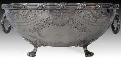 Of circular form, the body heavily decorated with scrolls and four cartouches comprised of engraved shells and floral swags, with applied fluted and leaf adorned rim and two drop loop handles of the same motif, all raised on four scroll feet.