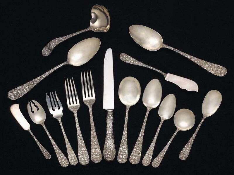 "Baltimore Rose" pattern, comprising twelve dinner forks, six luncheon forks, twelve salad forks, six ice cream forks, two serving spoons, six tablespoons, twelve soup spoons, twelve teaspoons, six bouillon spoons, one sugar spoon, eleven hollow handle dinnner knives, twelve flat handle butter spreaders, one master butter knife, and one gravy ladle.