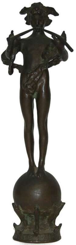 The nearly nude, patinated bronze figure playing flutes while standing atop orb supported by fish, signed and dated, "F. MacMonnies 1890," the base with partially indistinct inscription: "To Pan of Rohallion...Domini M.D.C..."