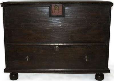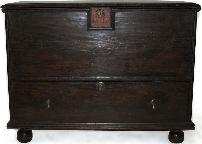 The rectangular top with molded edge lifts to well, the base with applied molding, a red-painted rectangle enclosing lock plate and the incised initials, "MG," molded base, raised on incised ball feet.
