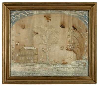 The first, a large landscape with house, trees, squirrels, birds, deer and butterflies, worked with silk threads on a twill ground; the second, a basket of flowers worked in polychrome silk threads on a silk ground.