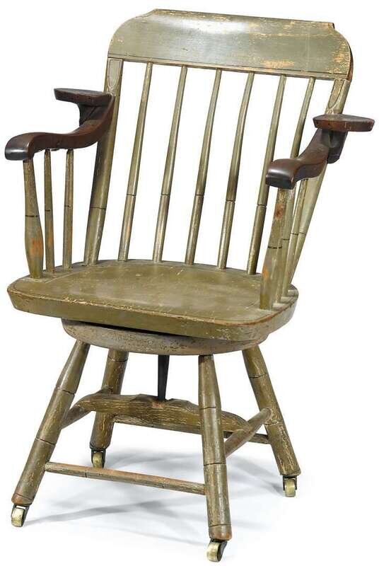 Green-painted swivel seat Windsor chair branded, "j.c. hubbard, boston"