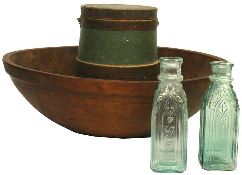 Including a large turned bowl with wide rim, a light green painted staved firkin with wire bail handle and two aqua glass pickle jars molded with gothic arches, one with the initials, "S.J.G."