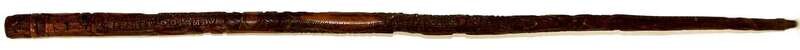 The shaft carved with profile of Jefferson, stars, American flags, Eagle and shield, the rotunda at the University of Virginia, Jefferson's tomb, leaves, fish and birds and inscribed, "University of Va. Rotunda burnt Sunday Oct. 27, 1895/ Jefferson's Tomb? Thos. Jefferson of Va. born Apr. 2 1743 was president USA 1801 to 1809/ wrote Declaration of Independence/ Founder of University VA 1819/ Died July 4 1820/ This cane was cut near Jefferson's Tomb/ Jefferson's Dying Words. I Resign my spirit to God my daughter to my country."