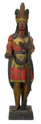 The realistically carved figure with full feathered headdress, an extended arm holding a bundle of cigars, the other holding a rifle, mounted on a rectangular base, painted in polychrome.