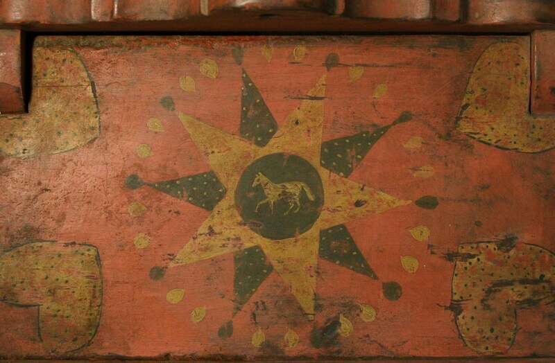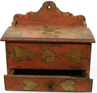 The rectangular box with shaped back, the backboard pierced with hanging hole above molded lid opening to a divided well and single molded drawer, molded base, painted salmon with yellow and black hearts, compass star, birds in flight and geometric devices.