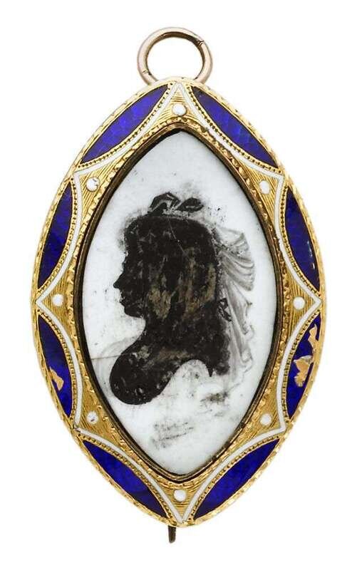 Ink and graphite on ivory, the gentleman on verso, set into an enameled, bright-cut brooch.