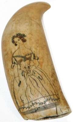 Incised and heightened with color, a figure of a fashionable young lady on one side and a two-masted square rigged ship on the other.
