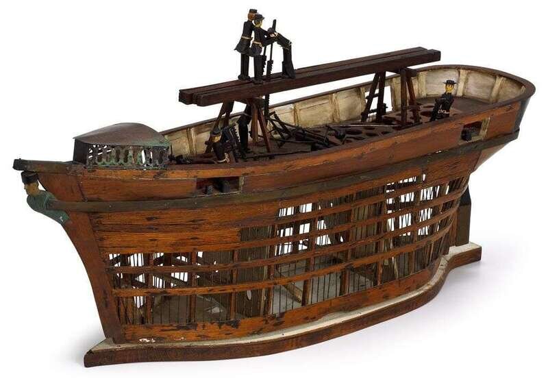 The articulated carved figures on ship's deck are activated when handle is moved below deck, the wirework hull possibly a birdcage.