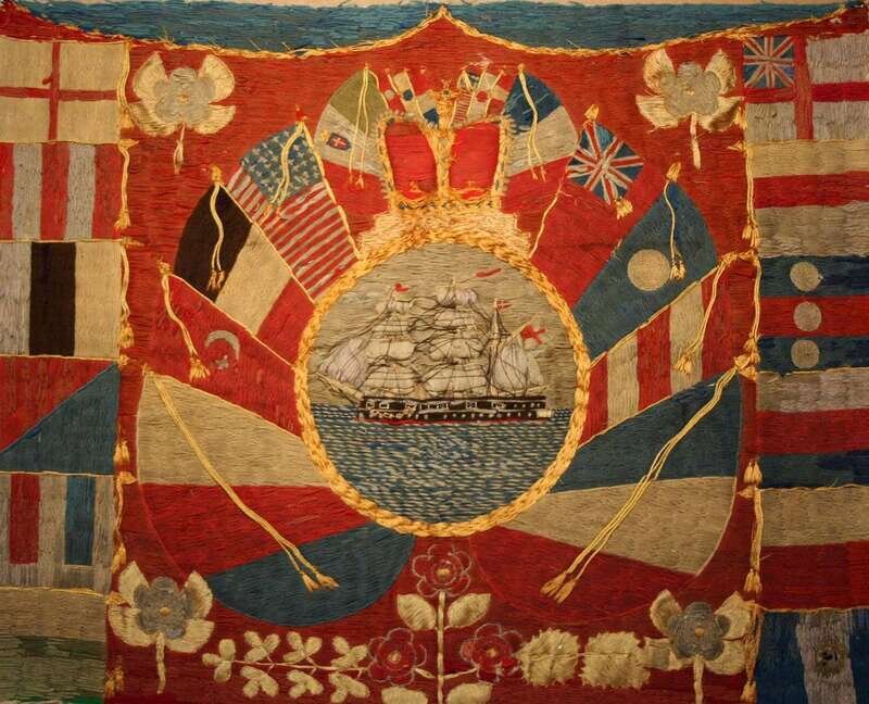 Border of nautical flags and flowers enclosing array of international flags, including that of the United States, and circular reserve with three masted ship at sea, framed.