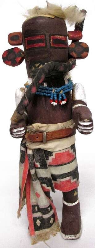 The standing figure with articulated bent arms and separately carved ears, clutching painted cloth snake and wearing painted cloth kilt and leather belt, beaded necklace, horse hair beard and fur headdress.