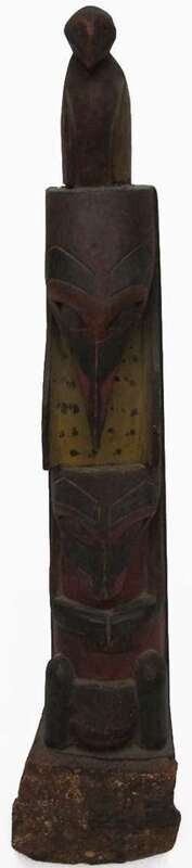 The four vertically-stacked, carved and painted totemic figures on wood base.