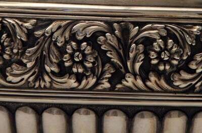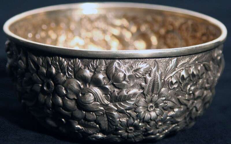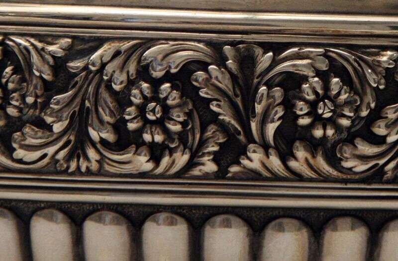 Of globular form with straight neck having thin repoussé foliage band, the applied C-shape handle decorated with acanthus leaf, the body with repoussé floral and foliage band above fluted base, monogram; together with a Davis & Galt repoussé small dish.