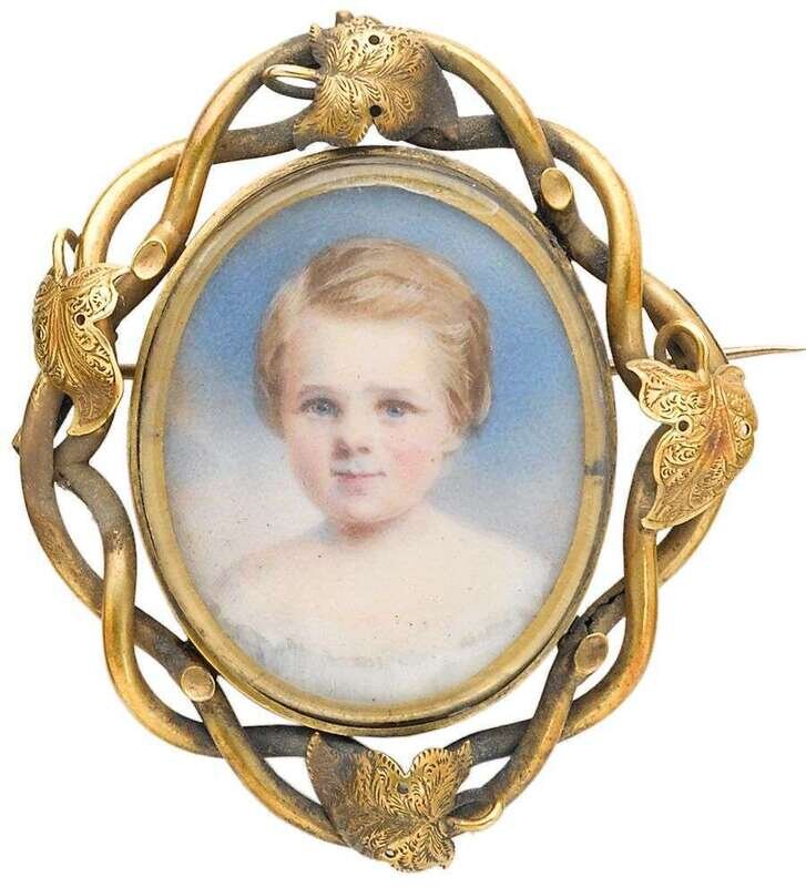 Watercolor on ivory, in brooch, the reverse with hair, pearls on a opalescent ground.