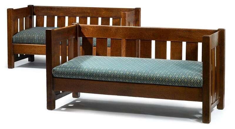 Pair of Arts and Crafts oak even-arm slat settles phoenix furniture company, grand rapids, mi, circa 1910
