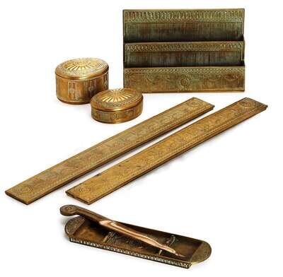 In the "Adams" pattern, comprising pair of blotter ends, letter opener, pen tray, stationery holder, inkwell, and hinged circular box, each stamped "Tiffany Studios New York" with various numbers.