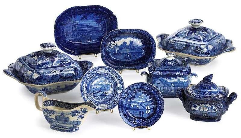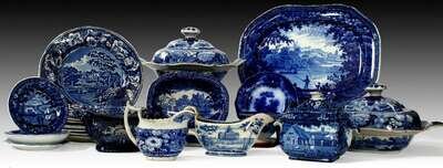 Including an Historical Blue plate, "Landing of Lafayette," gravy boat with "Boston State House," a small plate with "Landing of the Pilgrims," and two covered vegetable dishes printed in "Fonthill Abbey Wiltshire"; together with two platters, two covered sugar bowls, three open vegetable dishes, two dinner plates, and a salad plate in English scenes; two plates of Wilkie Designs, "Christmas Eve" and" The Valentine," three floral printed items and three flow blue items.