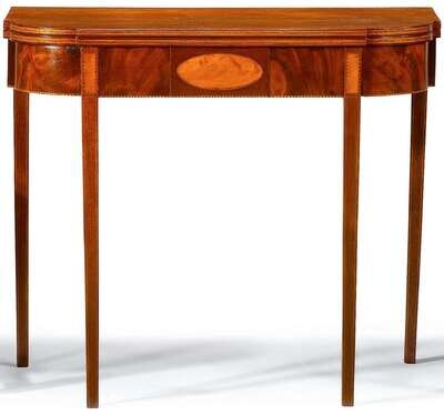 Rectangular top with ovolo corners with inlaid edge on conforming apron with central raised inlaid panel and inlay at leg tops, tapering squared legs with line inlay.