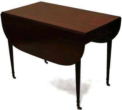 Rectangular top with "D"-shaped leaves on ring turned and tapering reeded legs ending in casters.