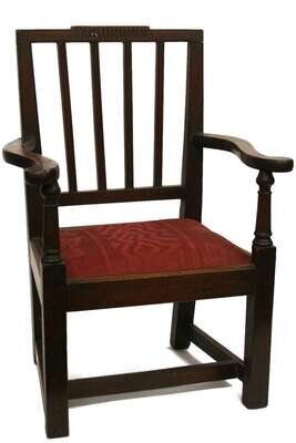 With spindle back and slip-in seat, flanked by outscrolled arms, straight legs united by H-stretcher.
