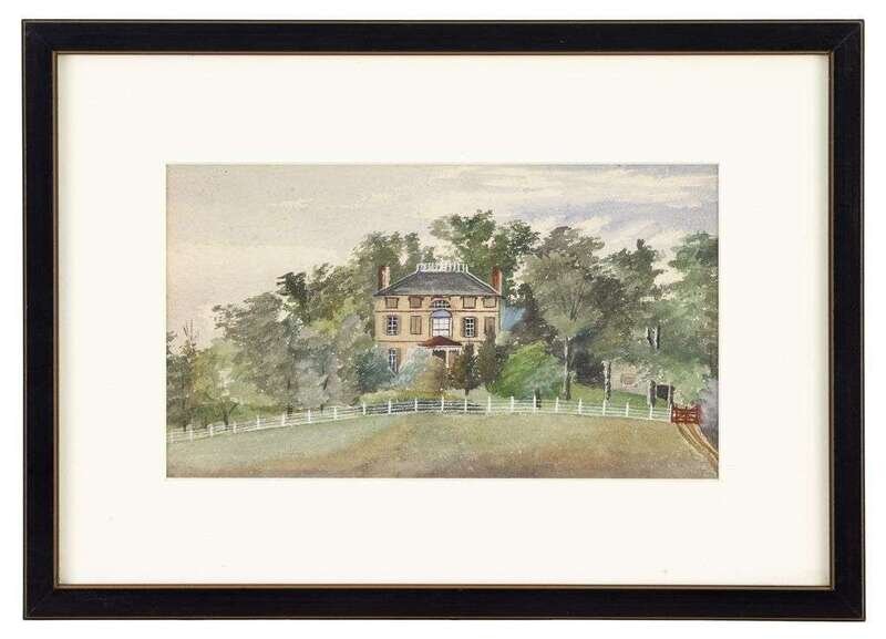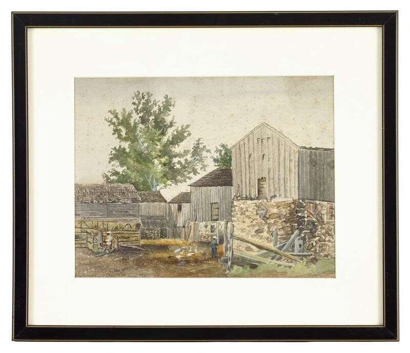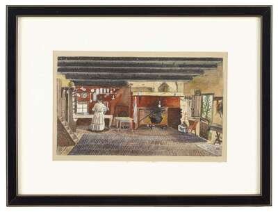 Depicting the exterior of the house, view of barns and interior of kitchen, watercolor on paper, framed.
