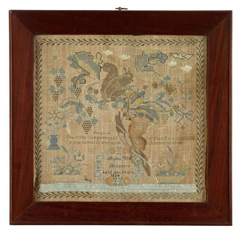 Inscribed, "Sophia W. Brognard aged 9 years 1824," a floral border enclosing squirrel in an acorn tree above a virtuous verse and spot devices, worked in silk threads on a linen ground, framed.