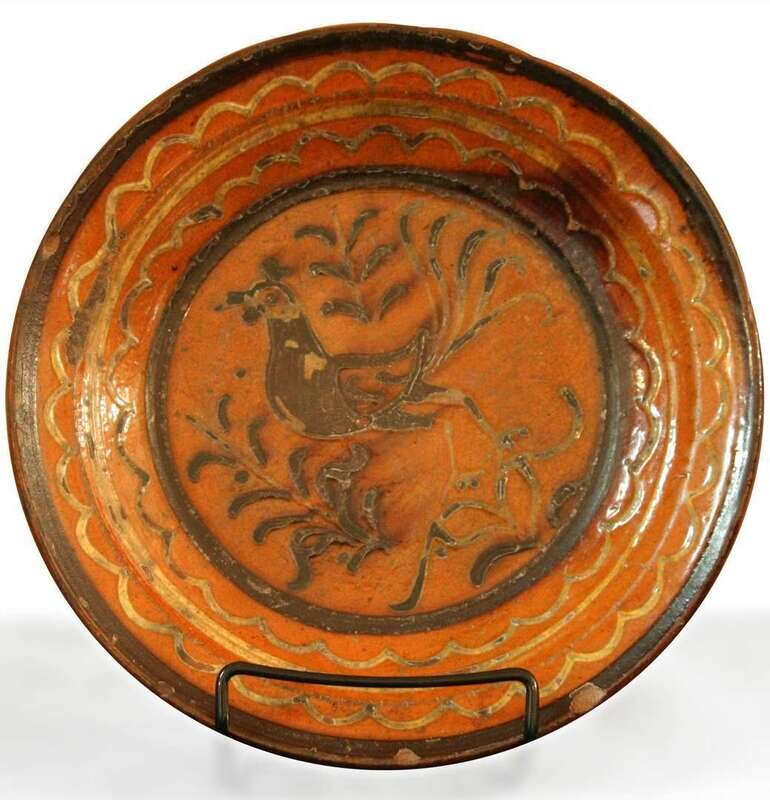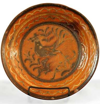 Sgraffito and slip-decorated redware plate attributed to david spinner, bucks county, pa, circa 1810